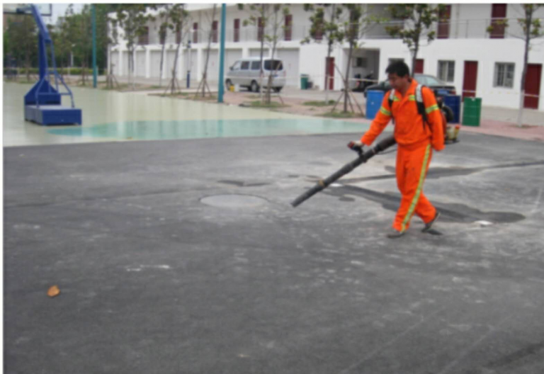 2、吹尘,利用汽油吹尘机的强大吹力将沥青路面上尘土及小石子吹出路面,保持路面洁净。