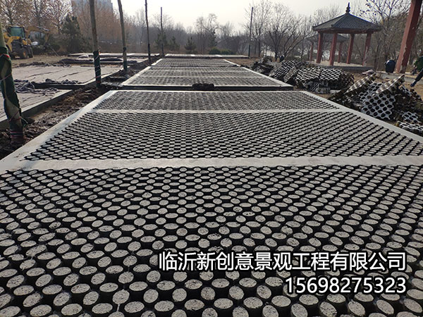 植草地坪是通过钢筋将用模具制作出来的混凝土块连接起来,形成一个整体,再在空隙中填满种植土,播种或栽种草苗的施工工艺。由于本草坪为连续性的钢筋混凝土石墩所构成,所以表面承重物或重车碾压后不会造成不平均的沉陷,且无一般预铸式植草砖、空心砖易破碎的缺点。因为所植之草具有连续性且草根不易受到破坏,所以可以一直循环保持绿植的连贯性。